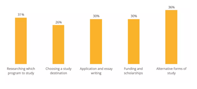 另外,中国留学生们希望各大高校能够提供各种信息和材料以供申请和择校。其中超过三成的人比较关注项目的选择、文书撰写和奖学金。而有36%的人更想要了解高校学习方式的多样性。
