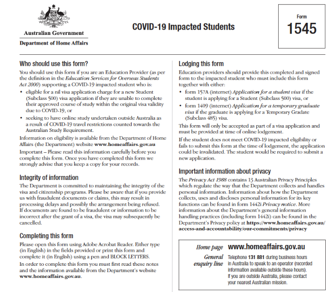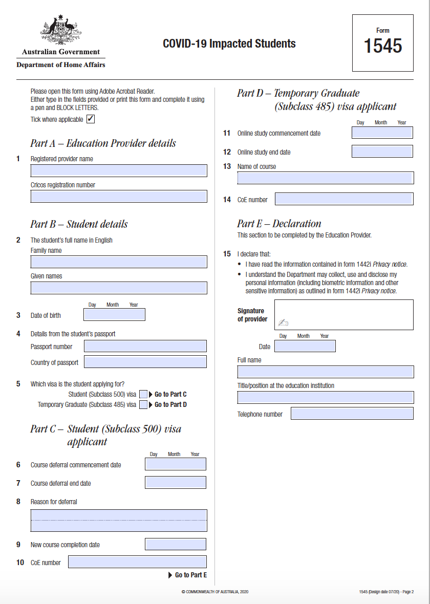 在线上递交学生签证申请时,同时需要提交 1545 form-COVID-19 Impacte Stuents表格(如下图),审核通过后可以免除续签费用!