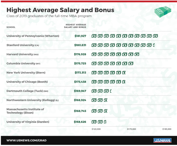 根据U.S.News 2019 年年度报道,2019年商科MBA毕业生的总体平均工资为106,757美元。顶尖商学院毕业生的工资更为丰厚,平均薪水为173,860美元。