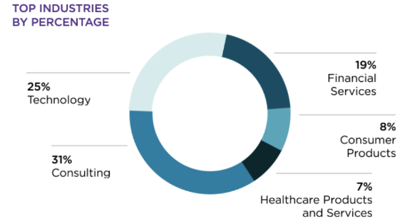 根据西北大学凯洛格商学院统计的数据: 毕业生有98%的就业率,毕业后所在领域比较多元化,咨询和科技行业占比较大。