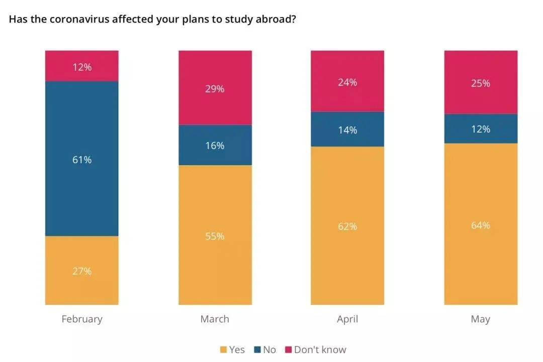另外从2月到5月的单月调查结果来看,留学计划受影响的人数确实是越来越多的。尤其是2-3月,受影响人数激增,翻了一倍,此后连续两个月维持在60%以上。