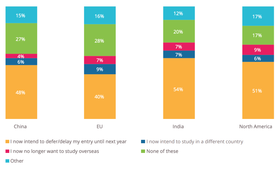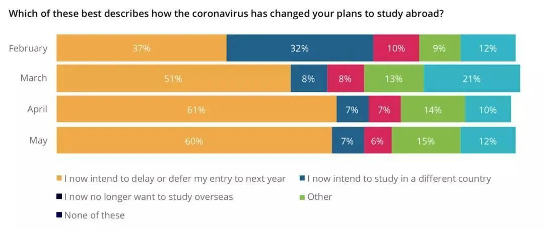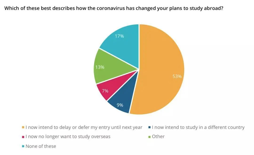 相比之下,我们可以看到现在有53%的受访者打算推迟,9%的人打算去另一个国家学习。