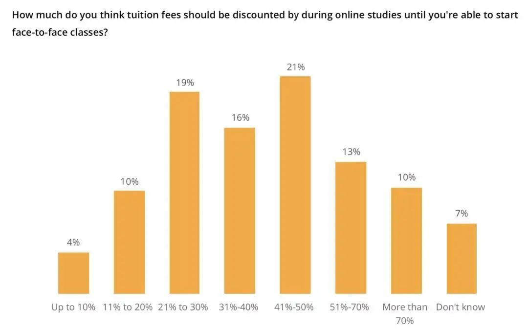 认为学费需要得到41%-50%学费减免的受访者最多,其次是21%-30%的减免,但是似乎有些不太实际。
