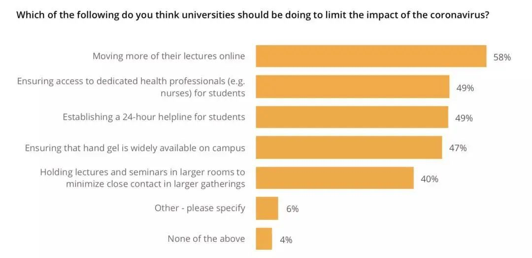 除了在线学习,值得注意的是,49%的受访者认为大学应该为学生设立24小时求助热线。