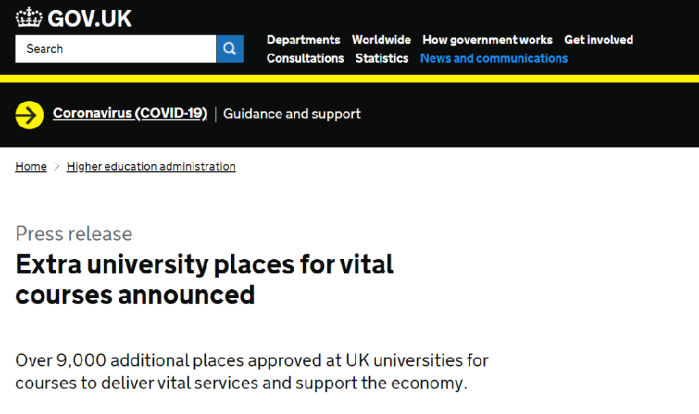 前两天,英国政府官方发布,为提供重要服务和支持经济的专业,新批准了9000多个额外入学名额。