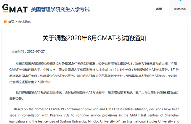 7月已经复考的上海、广州gmat考点和苏州大学、宁波大学、西安外国语大学和深圳赛格人才培训中心(共6个考点)继续提供gmat考试服务。