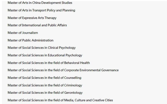 香港大学社科院(Faculty of Social Sciences)开设的硕士课程一共有下面这些: