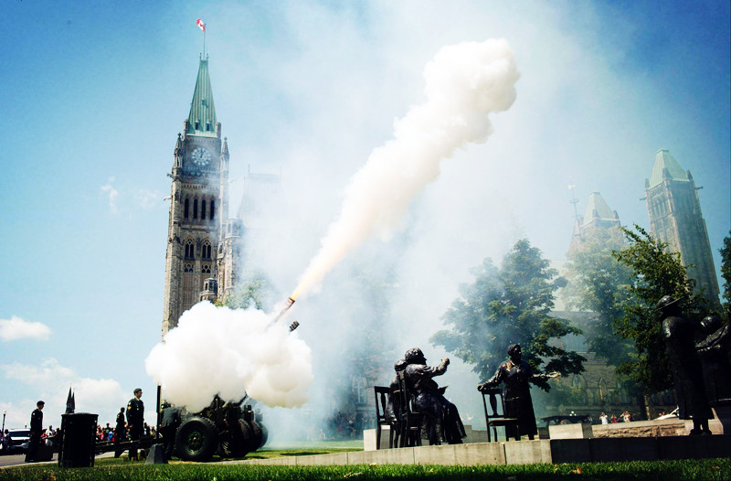 鸣礼炮起源于 17世纪时英国海军,当时大英帝国国力强盛,被称为「日不落帝国」,为了显示自己很牛掰,英国就要求其他国家在其海军进港或经过他国炮台时鸣放礼炮致敬以为尊崇。 相传从 1730年开始,英国海军就向国王和王后鸣放21响礼炮。在1875年,美国国务院与英国驻美公使达成协议,把鸣放礼炮作为迎宾的最隆重礼节,这个国际外交礼节就这样延续到了今天。