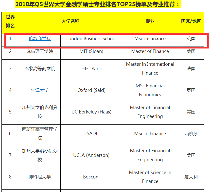 不管怎么样?让我们先了解一下这所神奇的学校吧 ? LBS 没有本科,所以没有综合排名,这也就是它在世界大学 QS 综合排名上没有一席之地的原因。然而, 这并不影响它的优秀。 2018 年全球 MBA 英国大学排名中, LBS 盖过牛津剑桥,位列第四。 QS 世界大学金融学硕士专业排名中, LBS 位列第一!!!