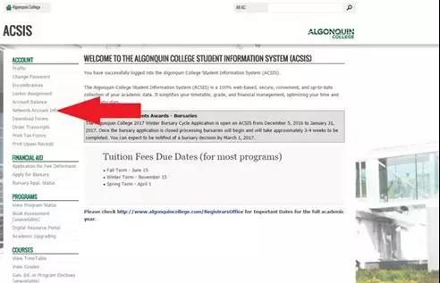 1. 登陆 https://acsis.algonquincollege.com/stuents/ ;