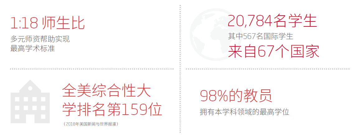 伊利诺伊州立大学被《美国新闻与世界报道》评为一级国家级大学,US News美国公立大学排名前80名,2017USNEWS美国综合排名第152名。伊利诺伊州立大学由于其杰出的教育贡献,是伊利诺伊州唯一一所被卡内基基金会评定为“国家博士研究型大学”的公立大学。学校的教学旨在为学生提供优质的本科生教育,大部分的大二大三课程人数在20人左右,其教师与学生的比例维持在1:17。学校下设六所学院,为本科生提供63个专业跨越160个研究领域。学校占地850英亩,有61幢建筑物,距离芝加哥210英里,圣路易斯265英里,交通方便。