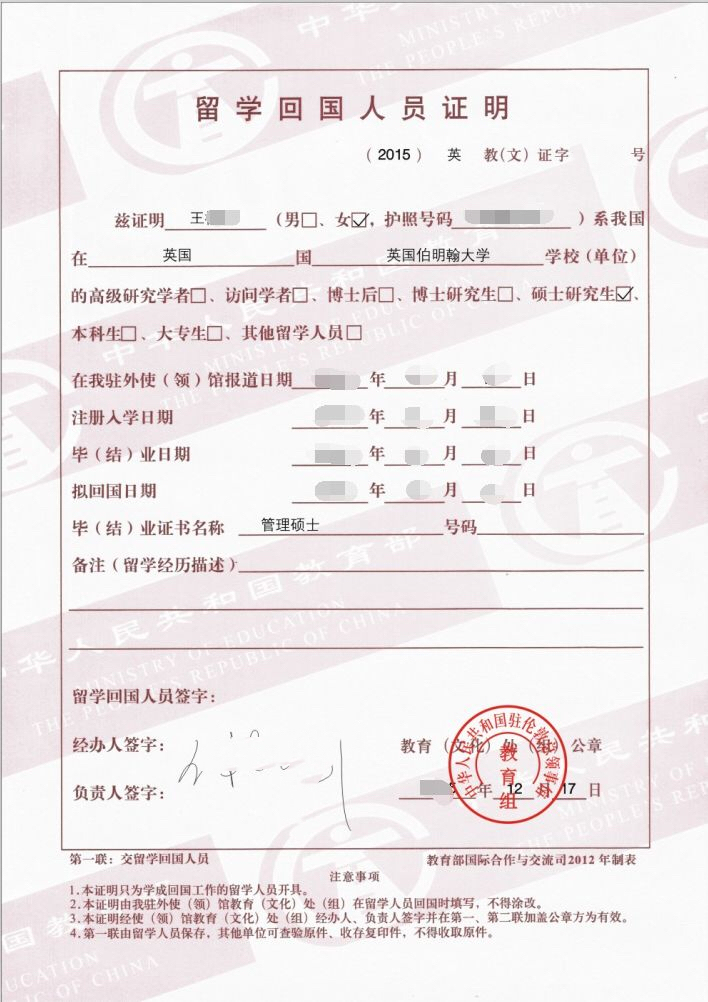 留学回国人员证明一共有三联,第一联和第二联由学生妥善保存,第三联是由英国驻英使馆教育处(或驻曼城总领馆教育组)保存留底。那如果想申请这个留学回国证明,都要具备什么条件? 第一种情况,你在英国需要持有效学生签证(Tier 4),并且在英国就读的是全日制(full time)本科及本科以上学位。第二种情况,你是持有学术访问签证(Acaemic Visitor)并在英国高校进修6个月以上或者持有工签(Work Permit)在英国高校、研究所从事6个月以上的博士后研究人员。这两种情况的申请人所就读、进修或工作的英国高校必须是被中国认可并被列入中英两国政府学位证书互认框架协议所包括的高等教育机构名单里。