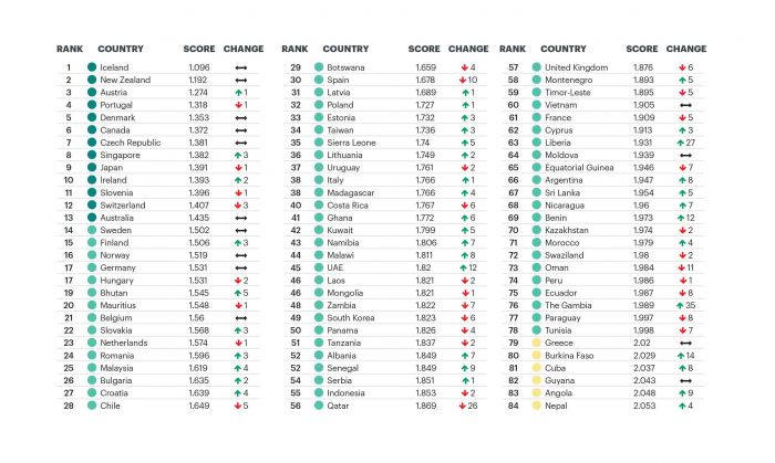 除冰岛外,最安全国家前十名大部分由欧洲国家占据,比如奥地利、葡萄牙、丹麦、捷克共和国和爱尔兰。新西兰、加拿大、新加坡和日本也进入前十名。然而报告还显示,今年有 92 个国家和平与稳定情况继续恶化,美国也未能进入世界前 100 ,排名 121 ,然而与去年相比,美国排名已经有小幅度上升。该报告称,政治两极分化、核武器、武器出口以及高监禁率是美国获得如此低分的主要原因。