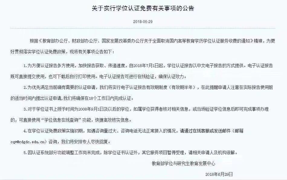 【重要紧急】清华认证从2018.7.1起更新的消息,我们初步看了官方出的公告,key point如下:1. 学位认证免费2. 学位认证报告以中文电子报告的方式提供3. 电子认证报告有效期:半年4. 除学位证书认证外,其他服务项目暂停受理。