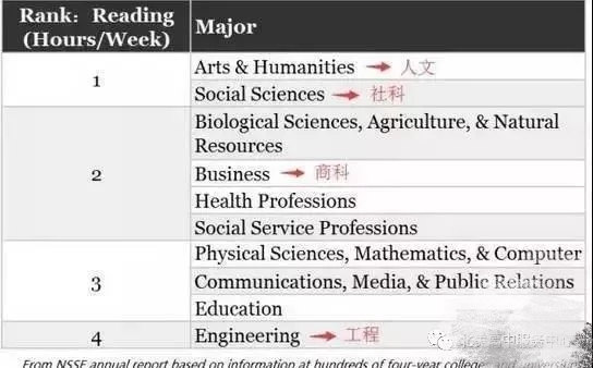 大学阅读量因专业和选修科目而不同。 在北美一所大学开展一项调查(National Survey of Stuent Engagement)显示,人文类、社会科学类专业的学生每周花在阅读任务上的时间最长,商科次之,工程类专业最少。 排名如下: