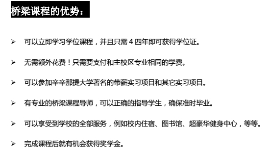 1 桥梁课程是为本科国际大一新生设置的,适合于只满足了申请条件的学术要求,但是语言成绩(即托福雅思成绩)还未能达标的学生,桥梁课程开设两个方向,文理以及商科。