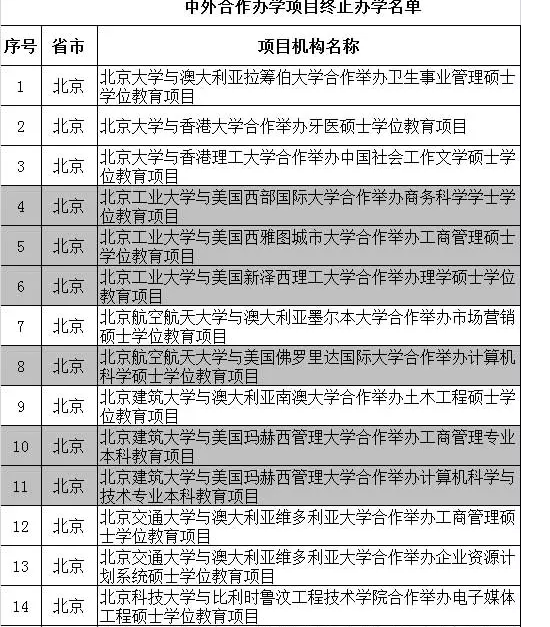 北京地区被终止的中外合作办学项目共计31个, 包括北京大学与澳大利亚拉筹伯大学合作举办卫生事业管理硕士学位教育项目、清华大学与澳大利亚悉尼科技大学合作举办体育管理硕士学位教育项目、中国科学院研究生院与香港理工大学合作举办软件科技理学硕士学位教育项目等。
