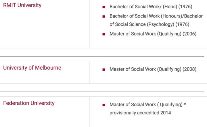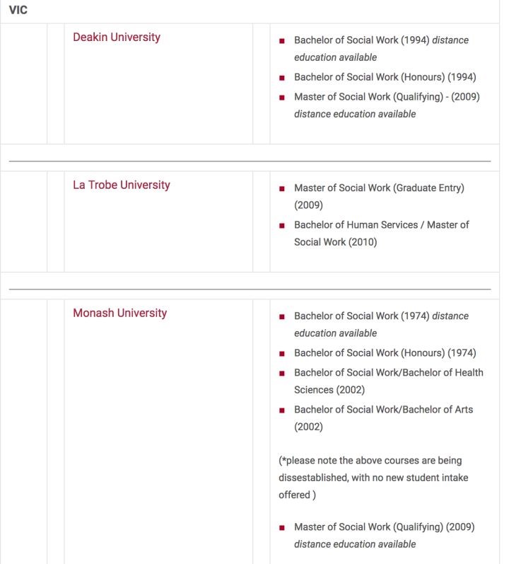 根据 AASW 官网公布的认证课程,维州的院校包括墨尔本大学,莫纳什大学,迪肯大学,拉筹伯大学, RMIT ,联邦大学。
