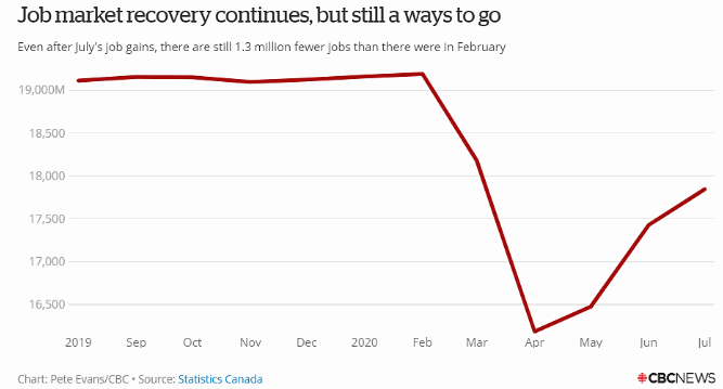 加拿大的就业市场在不断反弹,7月份,加拿大新增了 419,000 个工作职位,使失业率从 5 月份的高点 13.5% 降到了 10.9%。