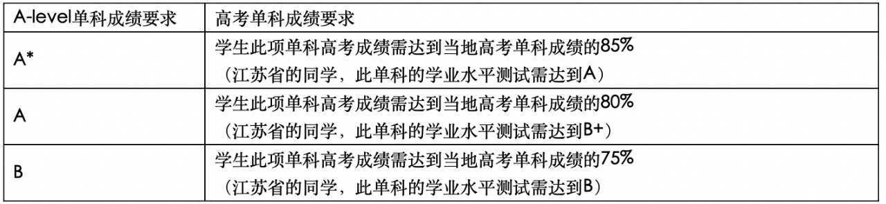 利兹大学高考分数标准与其A-Level录取标准有以下对应关系:若所申请的专业有单科A-Level成绩要求,则学生需要在高考中取得相应的单科成绩,具体对应关系如下: