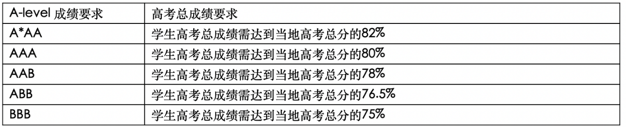 从2020年起,利兹大学的部分本科专业开始接受高考成绩直接申请大一,高考录取标准如下: