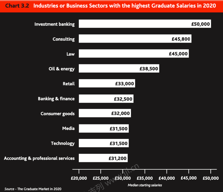 据报告显示,对2020英国应届毕业生薪酬最高的行业是投资银行业,高达50k;其次说顶级战略咨询公司,已将毕业生工资提高至45800英镑;第三名为法律行业。