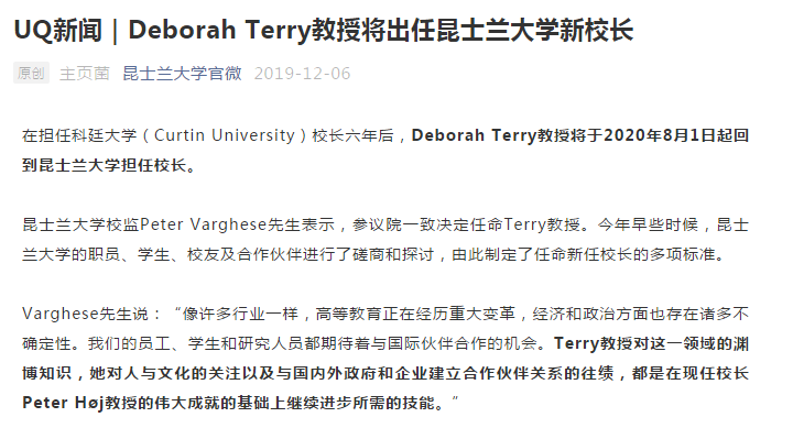 昆士兰大学(University of Queenslan)已任命科廷大学(Curtin University)负责人Deborah Terry出任该校下一任校长,以接替将于7月卸任的现任校长Peter Hoj。