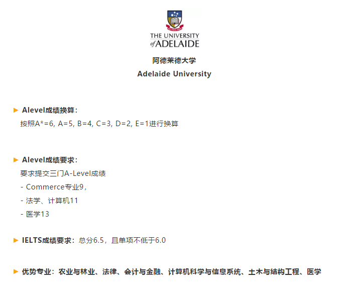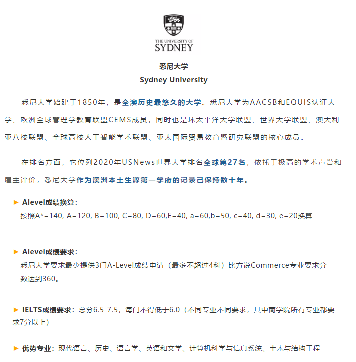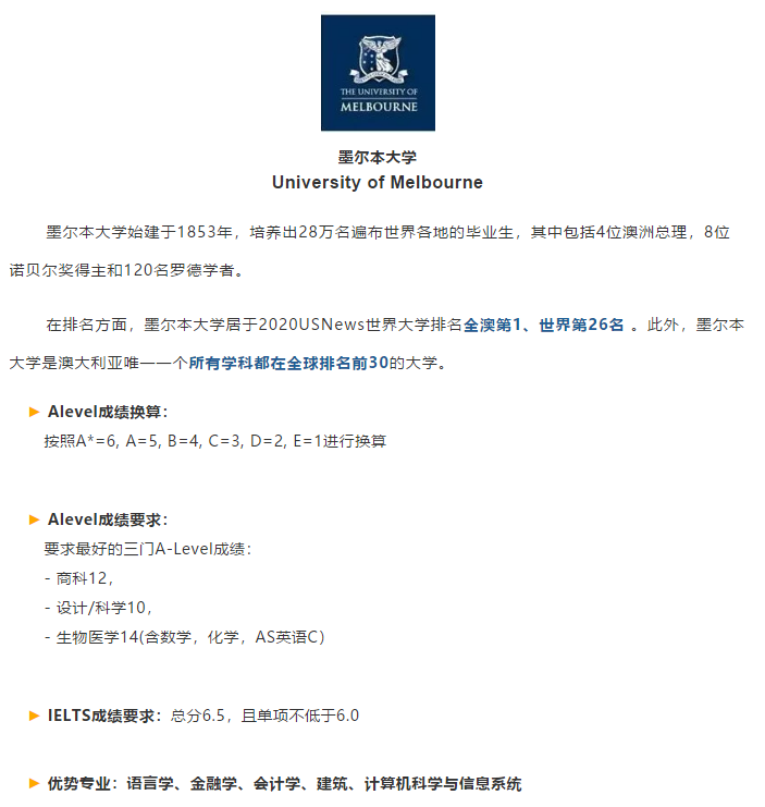 还有一种校方列出录取的A-Level等级要求,直接看学生最好的三门A-Level成绩的等级是否达到学校的录取要求,代表学校:悉尼大学、墨尔本大学。