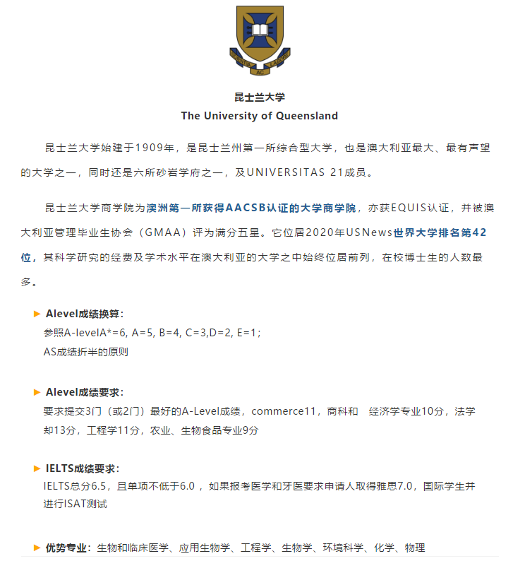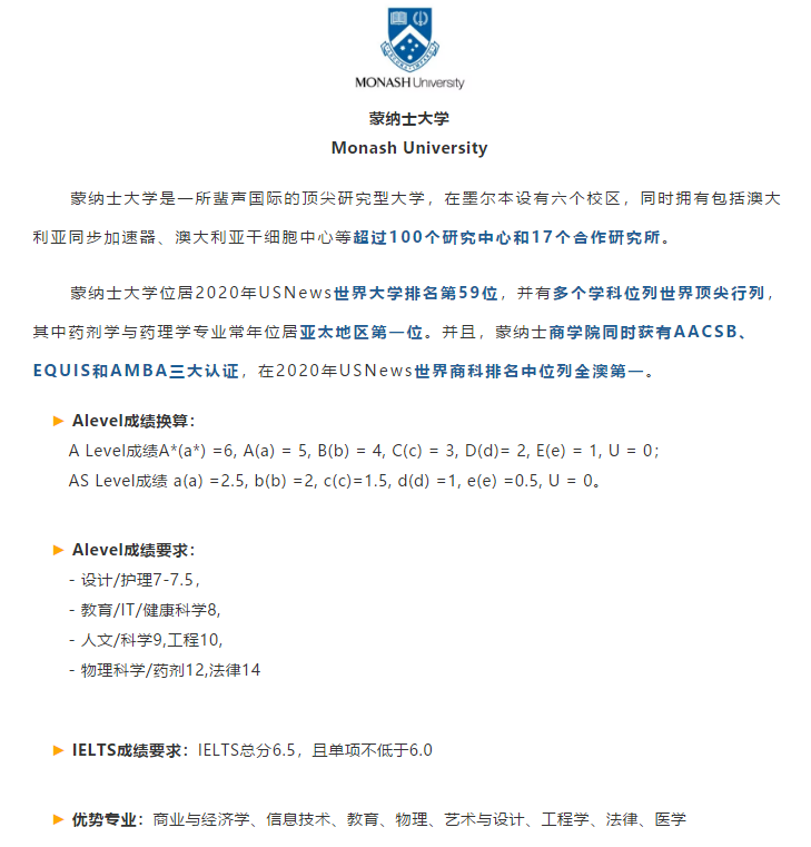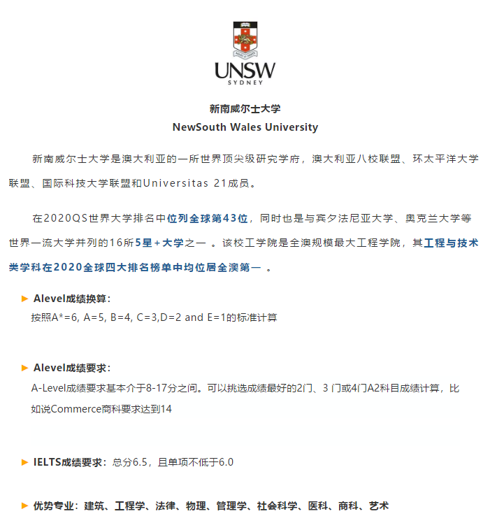 一种是将学生的A-Level的成绩等级按照A*=6,A=5,B=4,C=3,D=2,E=1的标准进行换算,看三门课的总分是否达到分数要求,代表学校:新南威尔士大学、莫纳什大学、昆士兰大学。