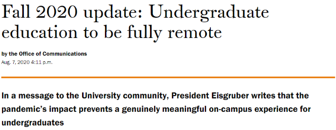 因此,学校计划今年秋季学期的本科课程将全部转移线上。而早在7月初时, 普林斯顿就已经宣布了学费减免10%的通知 。