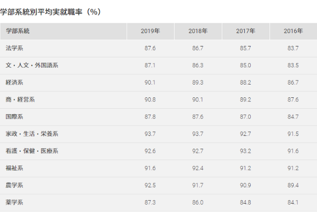 平均就业率最高的为「家政・生活・栄養系」,达到93.7%。最低的是「文・人文・外国語系」,就业率为87.1%。