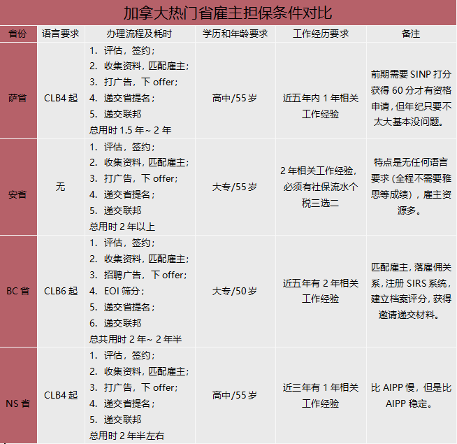 加拿大雇主担保条件对比(四个重点省份)