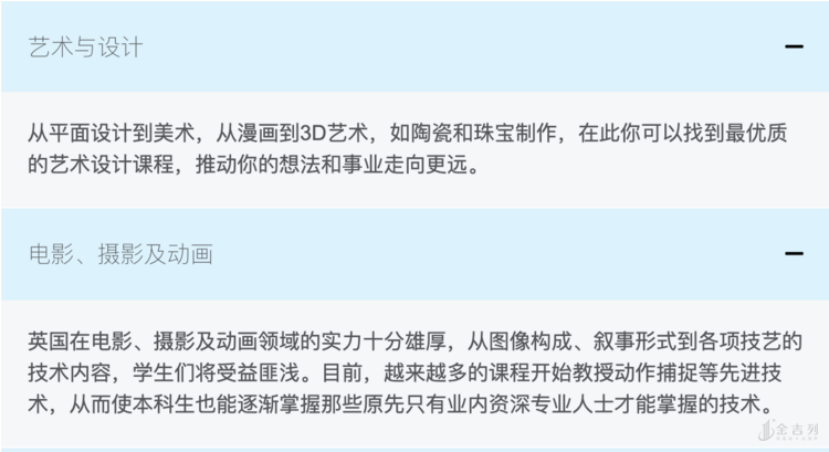 英国高校共开设了数以千计的创意艺术课程,其中包含2000多个艺术与设计课程。以下仅列举部分最受欢迎的课程: