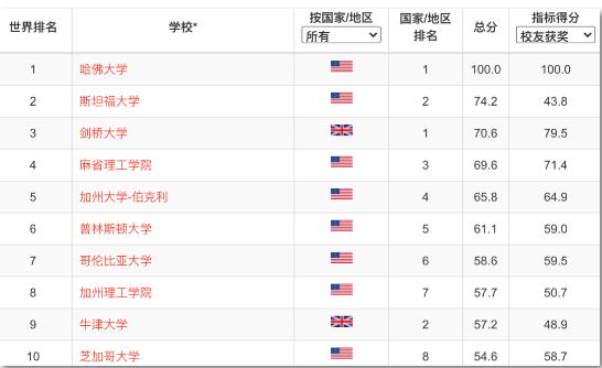 而在世界排名前十名中,依旧是被英美大学占据,其中美国占了8所,英国占了2所。