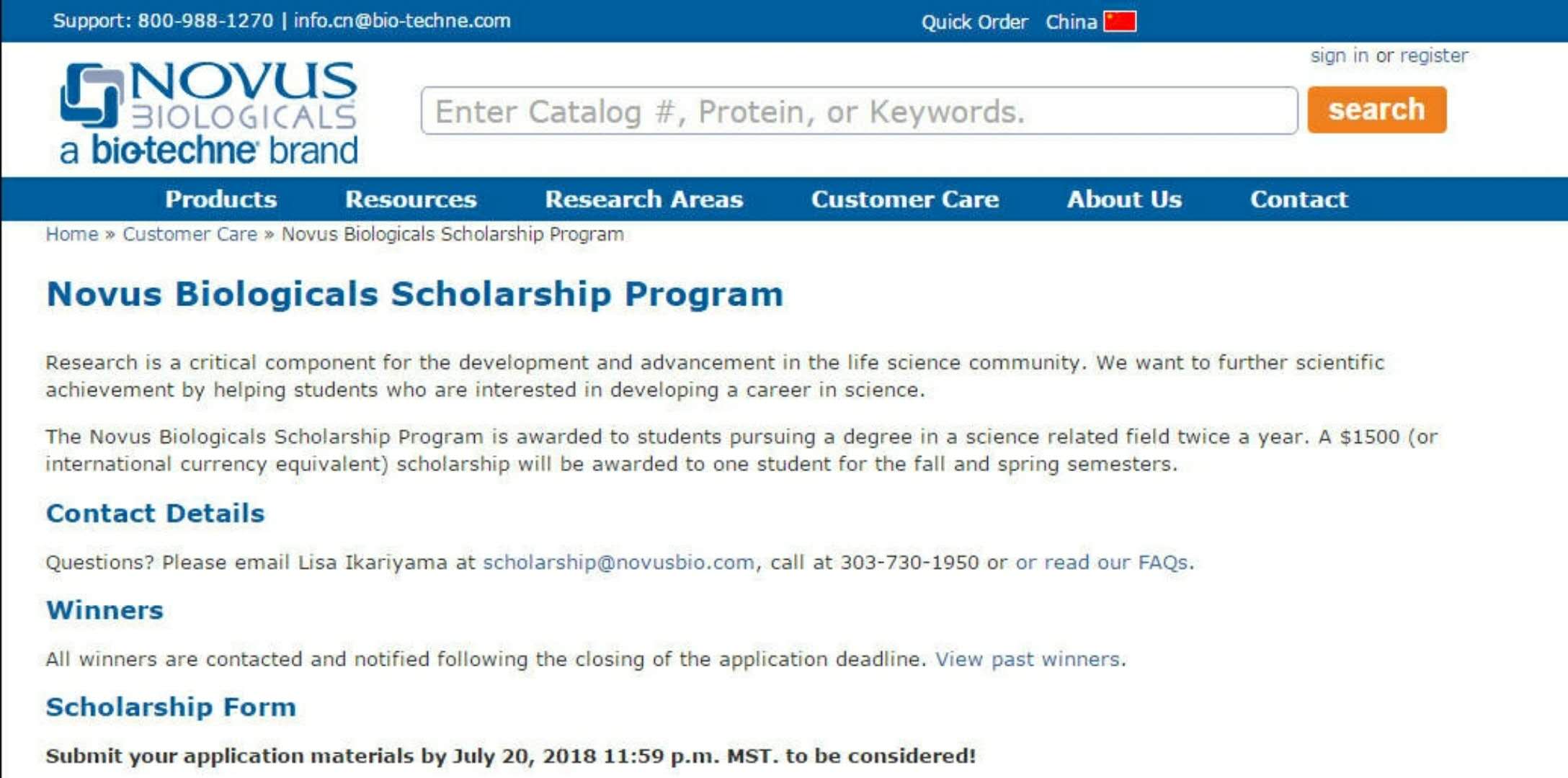 美国罗福斯生物制剂公司Novus Biologicals为国际学生提供奖学金,ovus Biologicals位于科罗拉多州,产品涉及神经生物学,肿瘤,DNA修复等多个研究方向。计划分别在秋季和春季学期。为科学相关领域的学生发1500美元奖学金。申请人不限学位,不限国籍,国际生要满足特定英语语言要求;提交成绩单、申请表、书面声明。申请截止日期:2018年7月20日