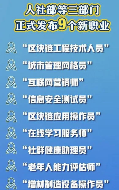 前不久,国家人社部等3大部门联合发布了新职业分类,新增了9种职业: