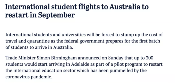 根据澳洲贸易部长的说法,留学生重返澳洲的计划将在今年9月重新启动,作为试验点,阿德莱德将会迎来300名国际留学生。所有国际留学生和大学本身将会被要求承担自己的隔离和旅行成本,不存在免费包机服务。至少计划又再重启,留学生返澳至少也看到点希望了。