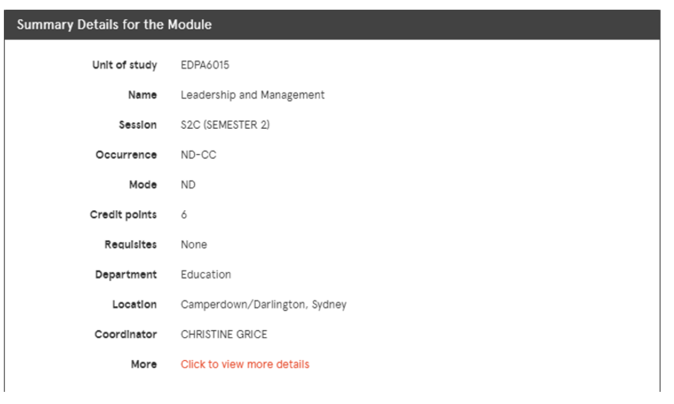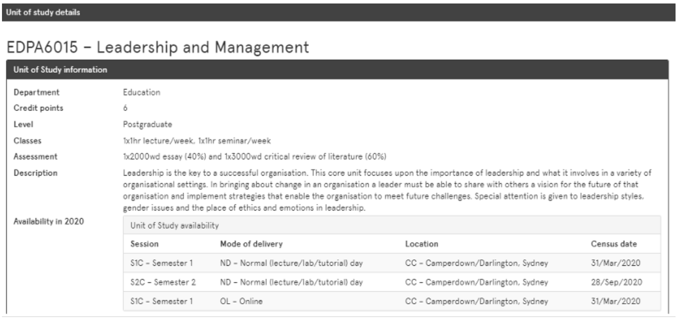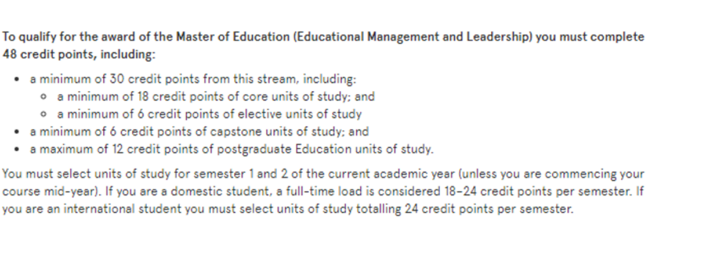 根据选课要求中可以看到 International Stuents 需要在两个学期一共修完48个学分, 每个学期修24分 并且需要在指定的Units里面进行选择。 ▼ 比如Master of Eucation (Eucational Management an Leaership)要求“ a minimum of 18 creit points of core units of stuy ”,即这个专业方向的学生必须在两个学期一共至少完成18 Creit Points 的主课学习, 即四门core units(每门6个学分) 中至少修完三门课程。