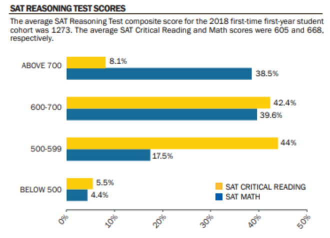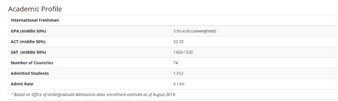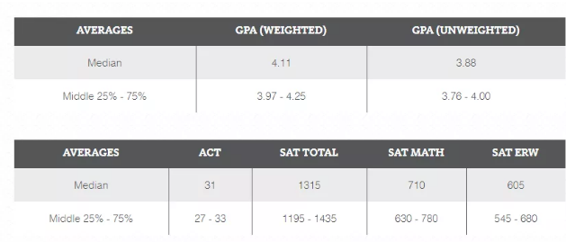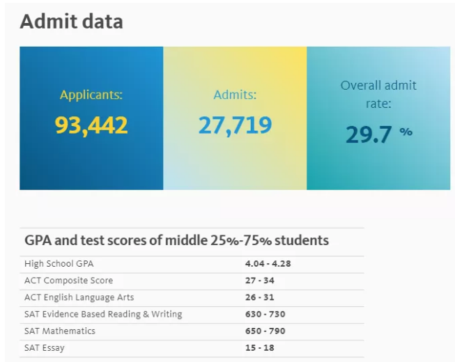 随着近几年排名上升较快,率取率一直在下降。建议托福95+,SAT 1350+,ACT 28+以上录取几率更大。