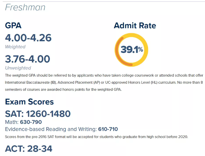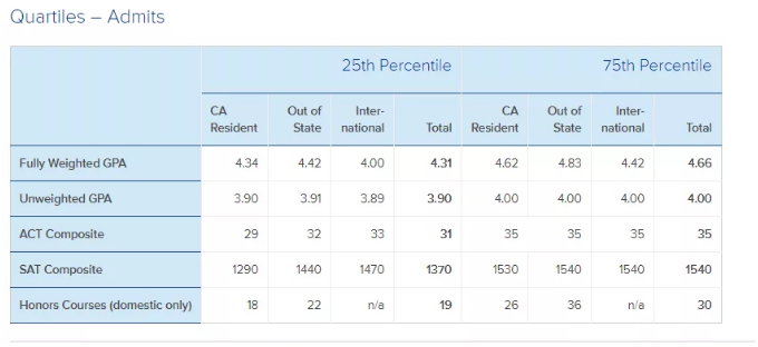 相比起伯克利,UCLA从数据上来看对于高分的学生是有偏爱。根据学校官网公布的录取数据,建议托福110,SAT 1540,ACT 35以上再申请把握性比较大。