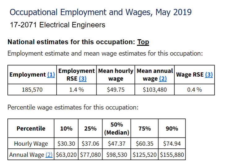 美国劳工部在一项关于电气工程的职业调查中显示,该职业集中于 研究、设计、开发、测试被用于商业、工业、军事或科学领域的电气设备、部件和系统 。统计显示,电气工程行业平均每小时工资为$49.75,年均工资为$103,480。
