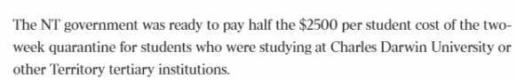 说到这里,大家最关心的应该还是隔离费用, 从报道中可以看到为期2周的隔离费总共是2500刀。在CDU和其他达尔文大学就读的学生和北领地政府将会分别支付一半的隔离费。