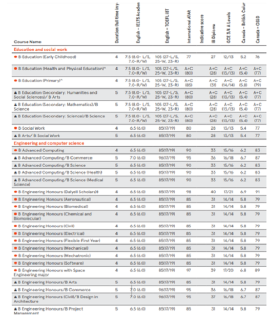 B Arts an Business /B Economics /B Eucation (Seconary) /B Music /B Engineering (Hons): 75%