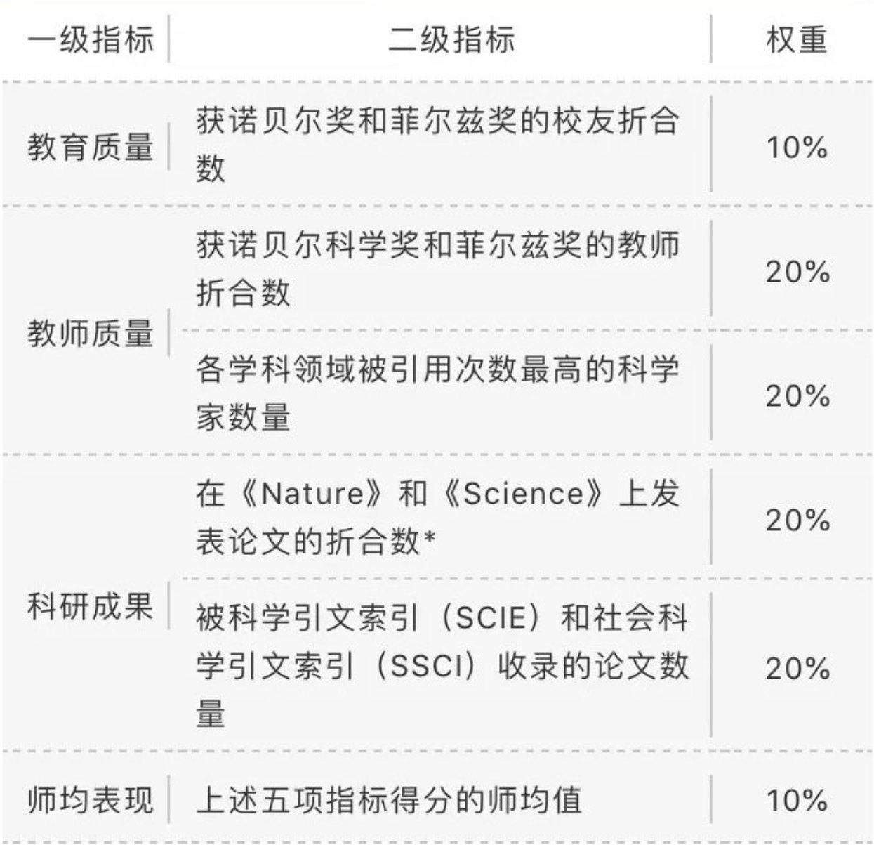 软科排名主要从教育质量、教师质量、科研成果、师均表现四个方面为学校进行打分。细化指标及权重如下表所示(具体指标定义可前往软科官网查看):