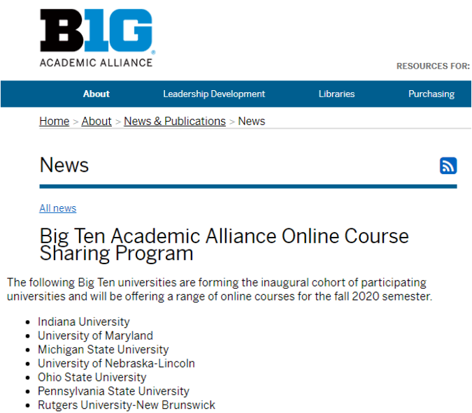 成员:密歇根大学、西北大学、伊利诺伊大学香槟分校、威斯康辛大学麦迪逊分校、明尼苏达大学、普渡大学、内布拉斯加大学林肯分校、印第安纳大学伯明顿分校、爱荷华大学、密歇根州立大学、马里兰大学帕克分校、宾夕法尼亚州立大学、俄亥俄州立大学、罗格斯大学。 以往能够互相上课的通常是地理位置靠近的小型教育机构,比如史密斯学院、曼荷莲学院、阿默斯特学院,这次Big Ten的合作反应高等教育界,为了度过危机,开始有意识合作共享资源。