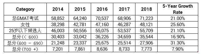 GMAT成绩在700分或700分以上的考生人数增加了7.9%。然而,这个数字并没有跟上报考人数增长的速度(21%)。