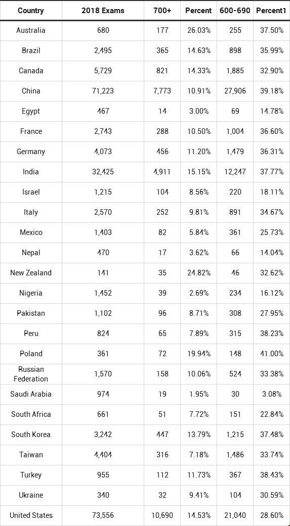 毫不奇怪,澳大利亚和新西兰的GMAT分数在700分以上的考生比例最高。不过,有一个例外是波兰,该国19.94%的考生达到了700分或700分以上。15.15%的印度考生和14.53%的美国考生都达到了这一标准。