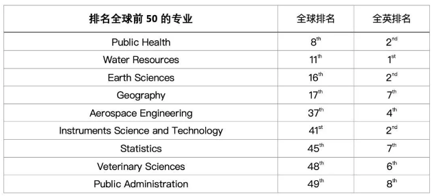 2019年GRAS排名中,布里斯托大学位列全球前50的专业有: