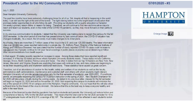 位于弗吉尼亚州的 汉普顿大学 是一所传统黑人学校,今年秋季学期将减少15%的学杂费,大约是2000美元左右。
