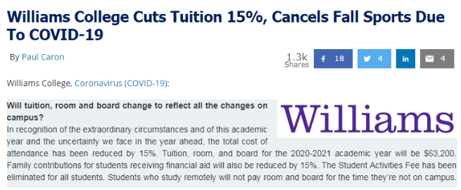 威廉姆斯学院可以说最富有的文理学院,坐拥29亿捐赠基金,也宣布2020年学费和食宿共降低15%,如果划去折扣,学费和食宿花费是63200美元。